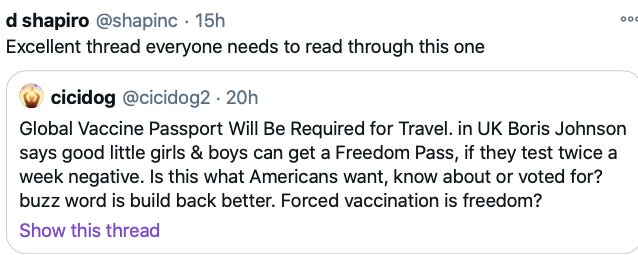 Already in the UK Boris Johnson says good little girls & boys can get a Freedom Pass, if they test twice a week negative. Is this what Americans want, know about or voted for? One buzz word is build back better. Forced vaccination is freedom?