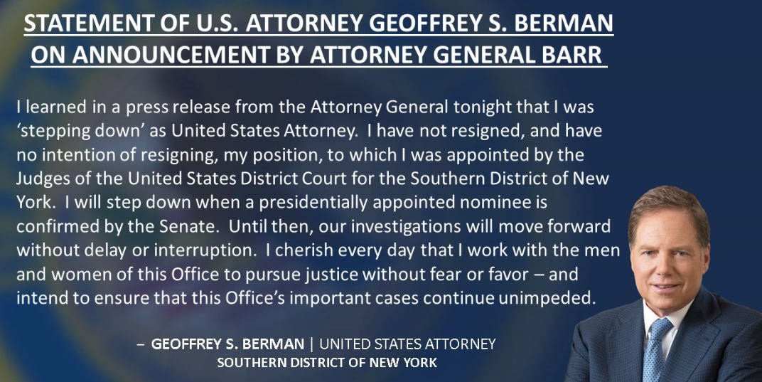AG Barr announced that US Attorney Berman is “stepping down” and being replaced by SEC chair Jay Clayton (who used to represent Deutsche Bank, which is under an ongoing criminal investigation by SDNY) as US Attorney for SDNY.
